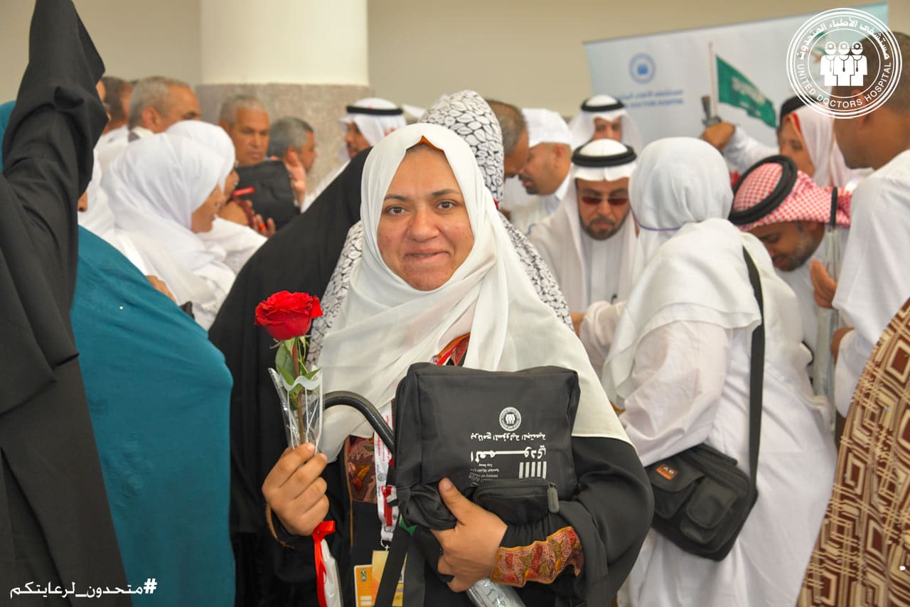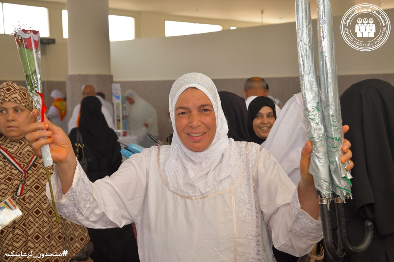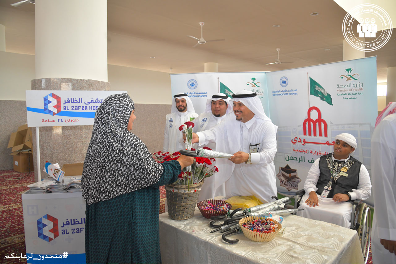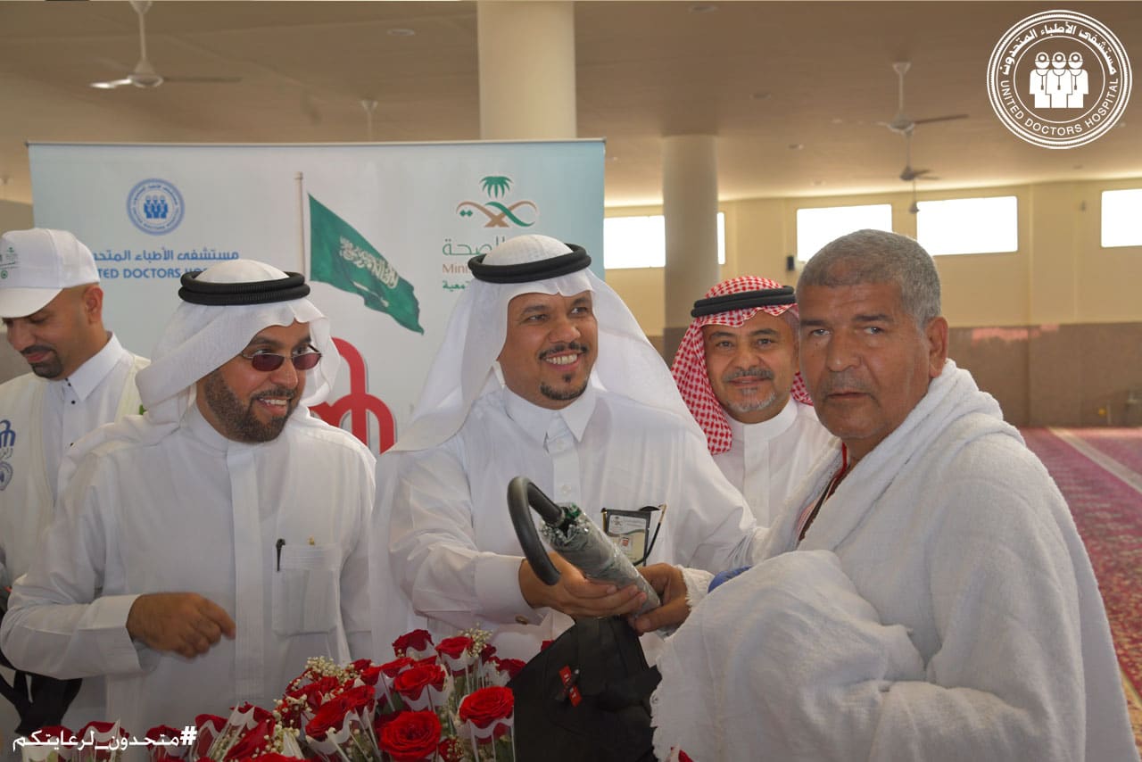 The hospital welcomed the pilgrims with flowers, and provided many gifts that were presented to the pilgrims, including glucometers, umbrellas with water spray cooling technology, in addition to a health bag containing first aid equipment and sterilization tools to facilitate the performance of rituals for pilgrims and provide health protection means to help the pilgrims maintain their health while performing their rituals.